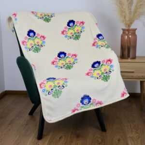 Koc polarowy łowicki wzór - ecru w kolorowe kwiaty łowickie