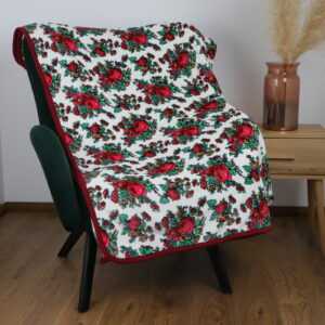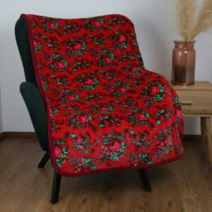 Koc polarowy łowicki wzór - czerwony w kolorowe kwiaty łowickie